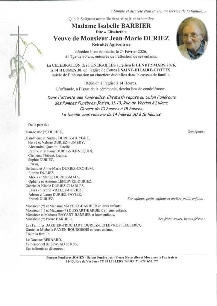 Madame Isabelle dite Élisabeth DURIEZ (Saint-Hilaire-Cottes)