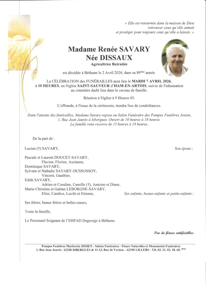 Madame Renée SAVARY Née DISSAUX (Ham-en-Artois)
