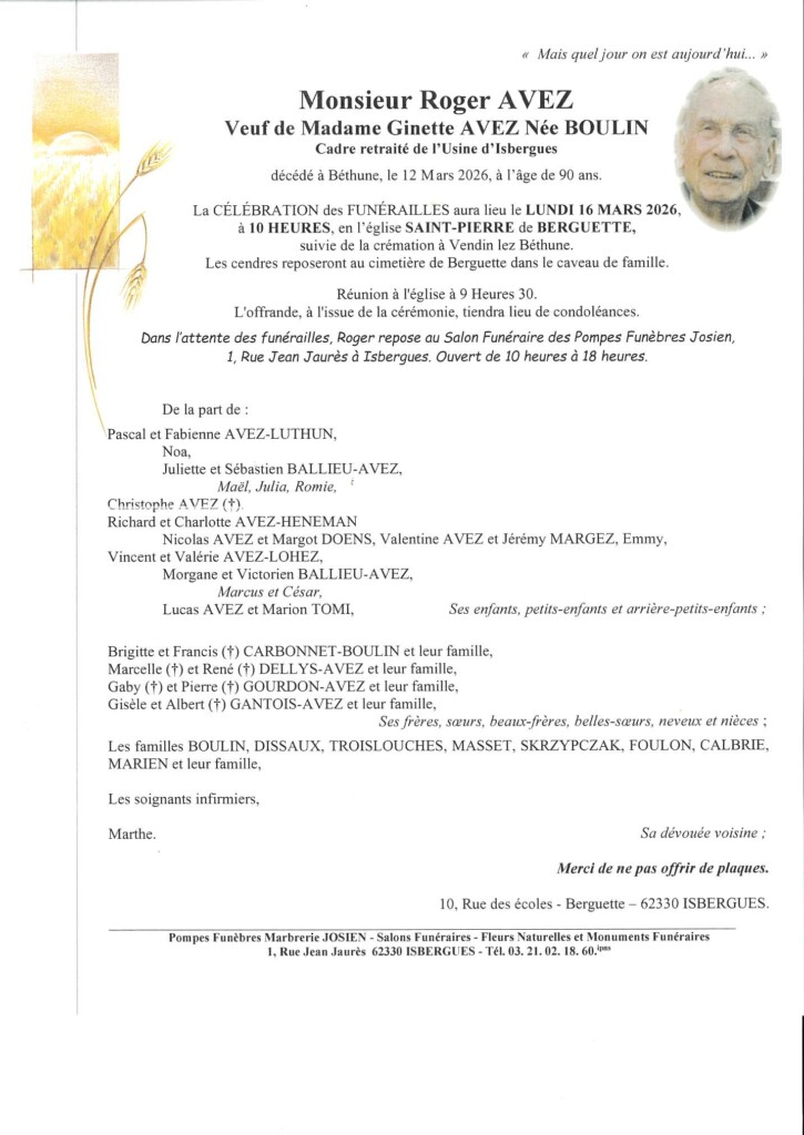 Monsieur Roger AVEZ Veuf de Madame Ginette AVEZ Née BOULIN (Berguette)